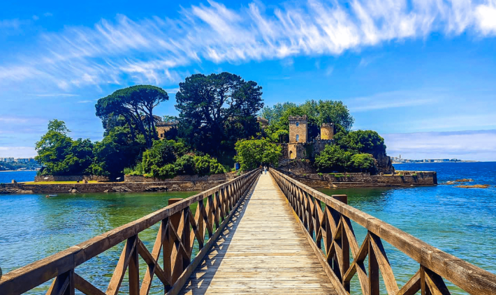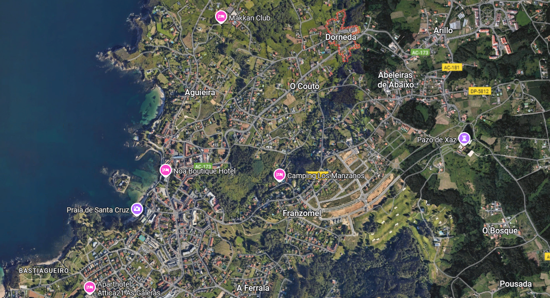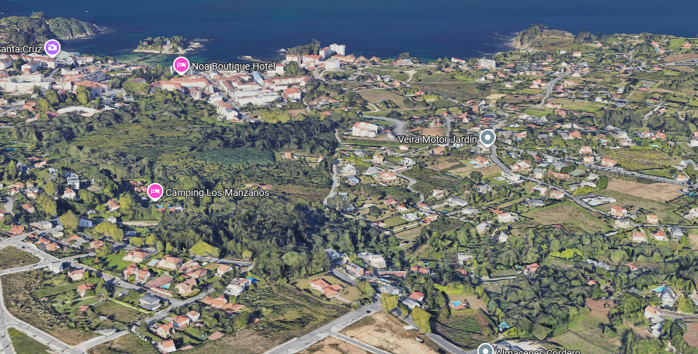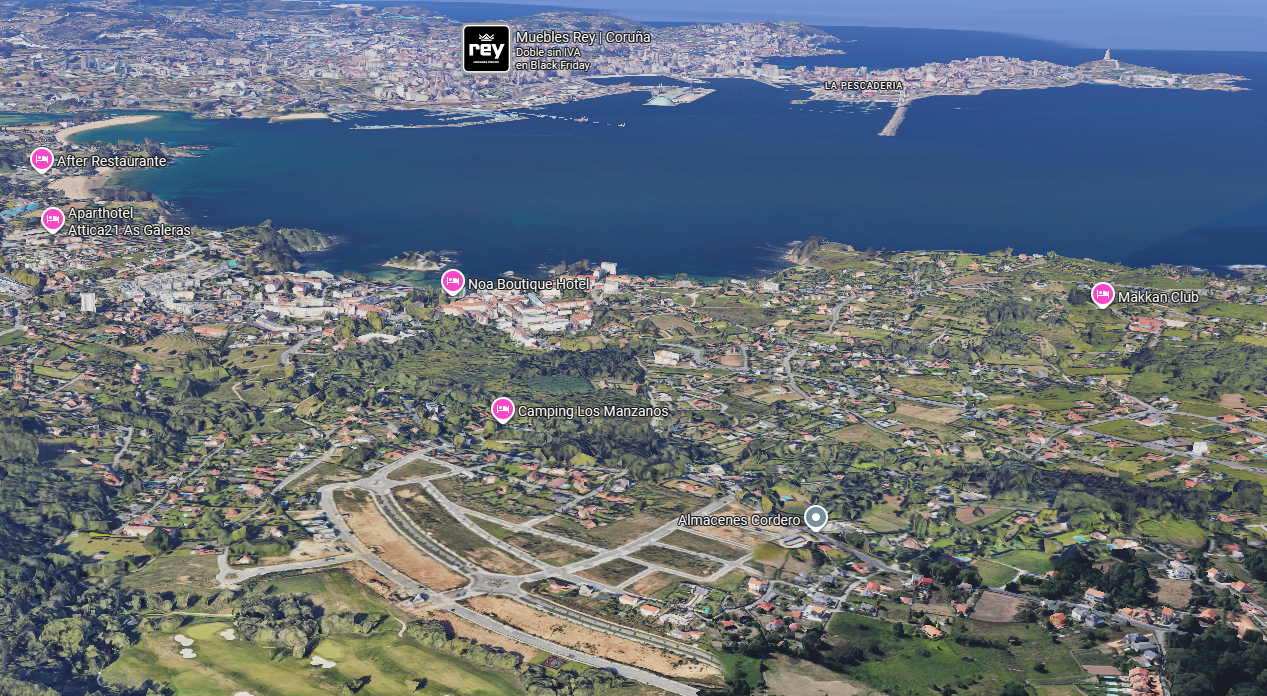 Situada en la Urbanización Golf Xaz, a 2 km del Puerto de Santa Cruz, con sus playas y todos los servicios, ocio y restauración…, a 9 minutos de la playa de Bastiagueiro, a poco más de Santa Cristina, a 20 minutos del aeropuerto y otros 20 del centro de La Coruña.